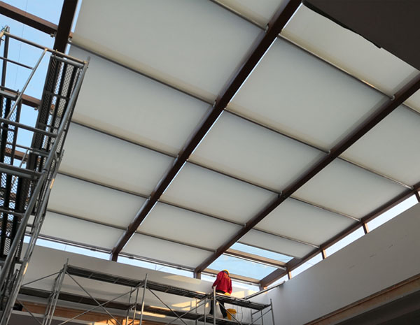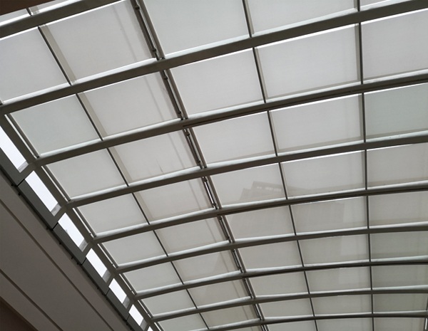 FSS天棚簾系統(tǒng)主要有管狀電機和彈性張力系統(tǒng)組成。一端為驅(qū)動軸,內(nèi)裝管狀電機;另一端為從動軸,內(nèi)裝彈簧機構(gòu),電機正轉(zhuǎn)帶動面料前行,另一端的彈簧逐漸收緊,將面料張挺,電機反轉(zhuǎn)彈簧逐漸放松,遮陽面料卷回。其操作簡便,電機工作時噪音小,運行平穩(wěn)。